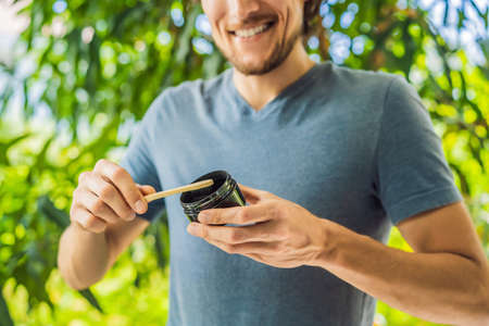 Young man brush teeth using Activated charcoal powder for brushing and whitening teeth. Bamboo eco brush