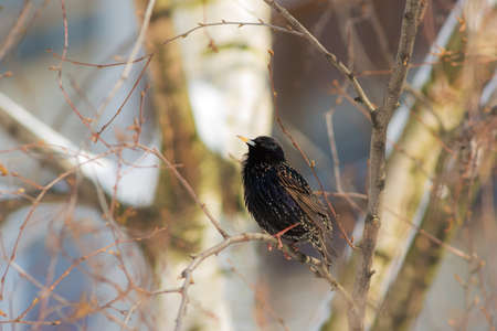 Starlings are sitting on the pavement. Birds in the city. The birds are waiting for food. Birds close up.