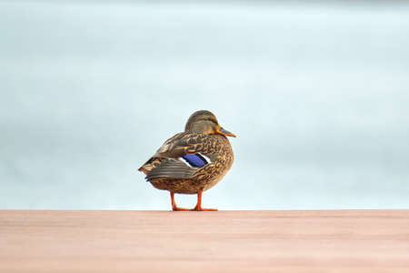 Lonely wild duck resting on lake shore wooden pier. Birdwatching concept