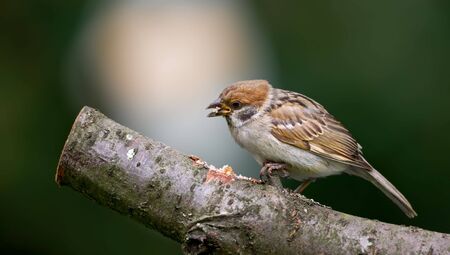 a small but formidable Sparrow sits on a concrete curb and opens its beak. Selective focus macro shot with shallow DOF