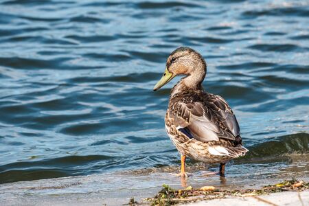 a grey duck stands on the edge of the Bank and looks at the water. wild duck in the city