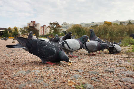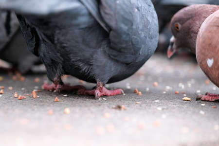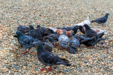 Pigeons in a city. concept of dirty hungry birds in the town.
