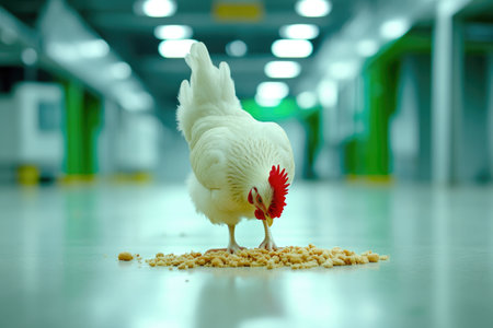 Chicken Pecking at Food in a Clean, Well-Lit Indoor Pen