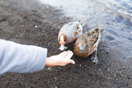 Male hand-feeding ducks. Wild water birds in winter swim near coast. Blue water background. Artificial feeding site.