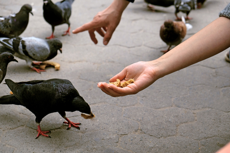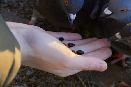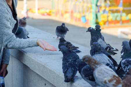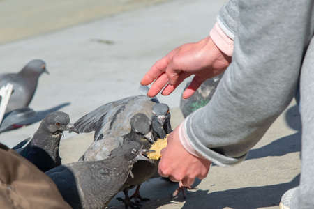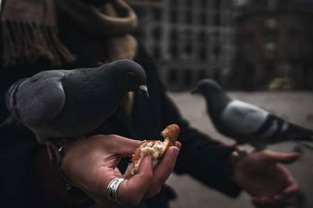 pigeon feeding and balancing on womans hand. caring person feeds pigeons in the city in cold weather