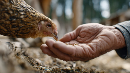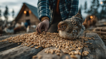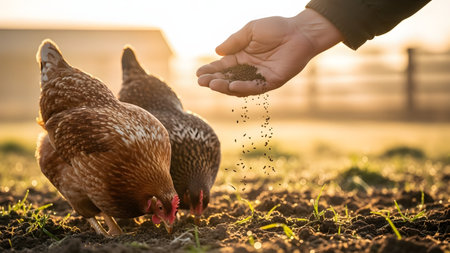 A close-up of a farmer's hand pouring seeds or grain to feed two brown chickens. The scene is backlit by the warm, golden light of a sunset, highlighting the connection between humans and animals in a sustainable, rural farming environment.