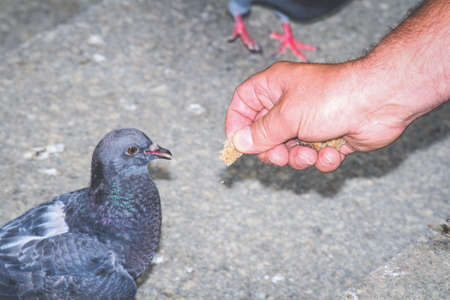 Man is feeding pigeon with breadcrumbs, seen only hand