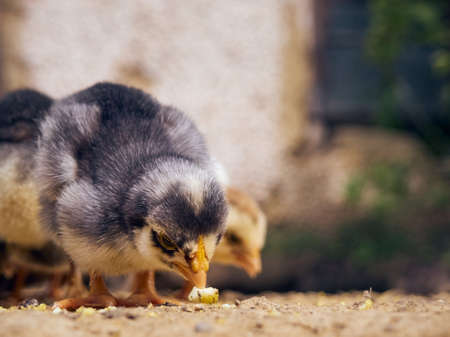 Selective focus on the land on which corn is spilled for feeding chickens. In the back the chickens are eating corn. Copy Space. Agriculture.