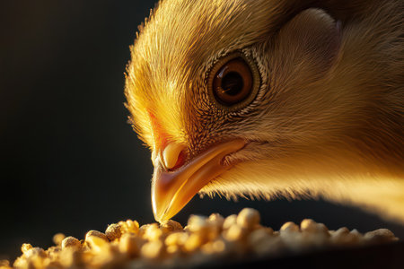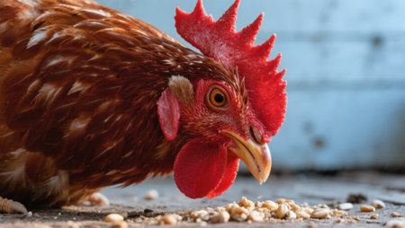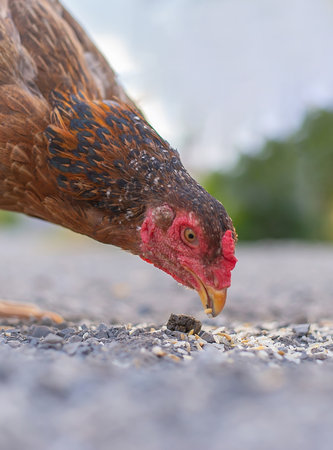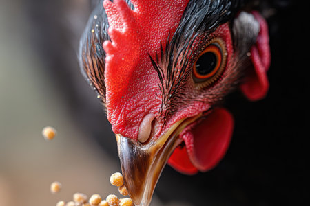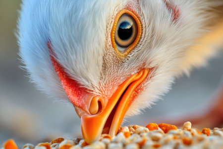 Detailed view of a chicken beak mid-peck, eating grains on the ground, showcasing farm life and poultry feeding behavior.