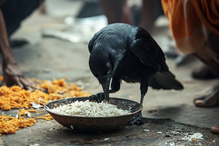 A crow consumes rice offerings during pitru paksha ritual symbolizing ancestral nourishment