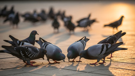 A low-angle shot of a flock of pigeons feeding on a paved surface during the golden hour. The soft, warm light of the sunrise or sunset casts long shadows and highlights the iridescent colors on the birds' necks.