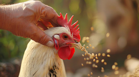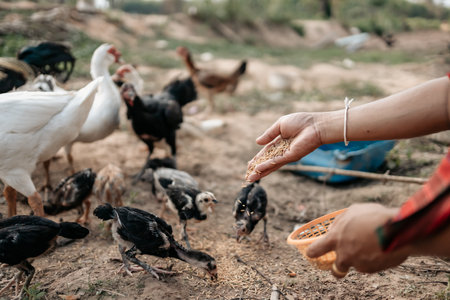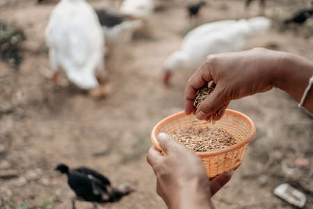 Hand of farmer feeding chicken, hen, duck and goose with rice and grain at farm in the evening. Natural organic farming concept