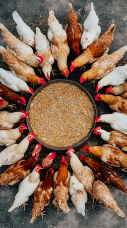Numerous chickens gather around a circular feeder, enjoying their meal in a backyard chicken coop, showcasing a sustainable and organic farming practice