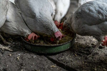 White chickens with red tufts eat grain from a bowl. Chickens in the village. Keeping and feeding chickens at home
