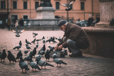 Senior man crouching in a bustling city square, gently feeding pigeons from a small basket, embodying kindness and connection with nature