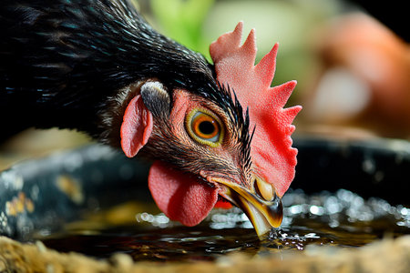 A black-feathered chicken leans over a water bowl, sipping joyfully as sunlight glistens off the surface. Surrounding greenery adds a lively touch to this tranquil farm moment.