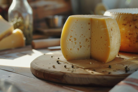 Artisan cheese wheel on a wooden cutting board with peppercorns, bathed in warm sunlight