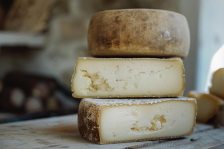 AI Generated. Stack of aged artisanal cheese wheels on wooden board