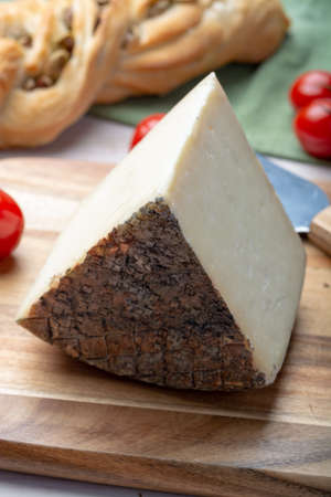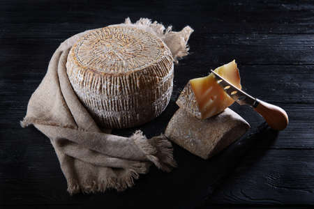 Cheese collection, aged hard Italian sheep cheese black pecorino from Sicily island or pecorino nero di Sicilia close up
