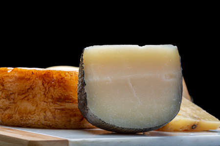 Cheese collection, French fol epi cheese with many little holes, etorki, tomme noire des pyrenees and ossau iraty cheeses close up