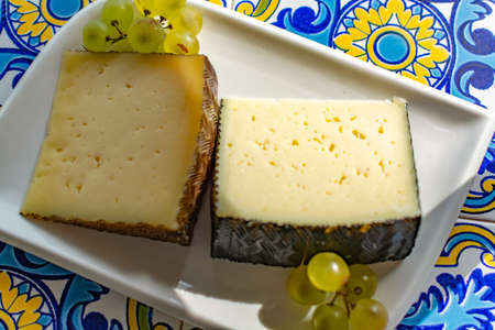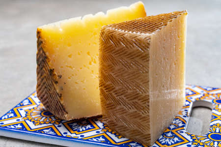 Cheese collection, variety of Spanish hard manchego cheese made from cow and goat milk