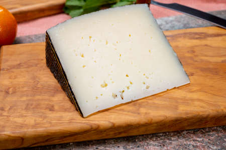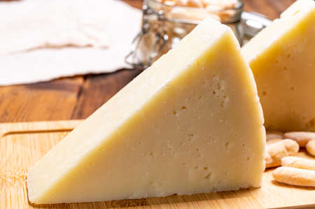Cheese collection, piece of Spanish hard manchego cheese made in La Mancha region from sheep milk close up