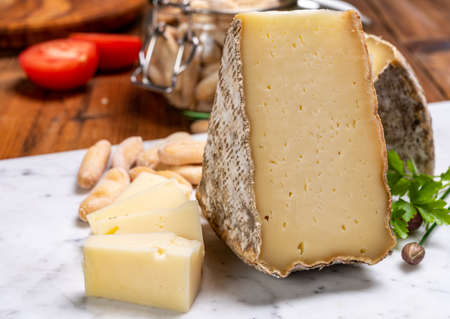 Pieces of cheese tomme de montagne or tomme de savoie made from cow milk in French Alps.