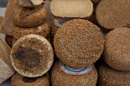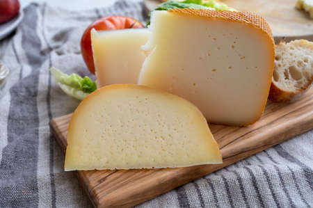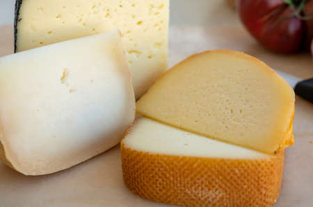 Cheese collection, French fol epi cheese with many little holes, etorki and ossau iraty cheeses close up