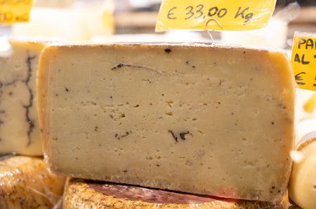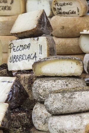 Selection of traditional Italian cheeses on a display, selective focus