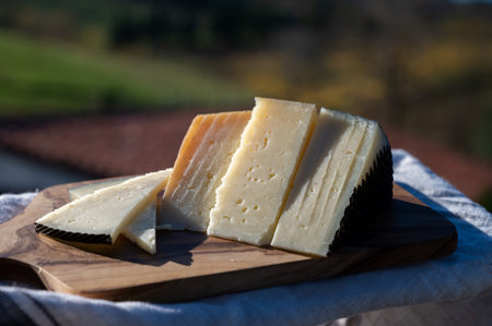 Assortment of Spanish hard cheeses, curado, manchego, goat and sheep cheeses served outdoor with view on green meadow and old cheese farm in Spain