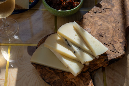 Spanish hard manchego, cow, sheep and goat cheese served outdoor in morning sunlights close up