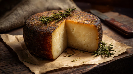 Rustic cheese wheel with firm interior and rosemary sprigs on parchment over wood. Ideal for editorial, culinary, gourmet, or artisanal food photography themes.