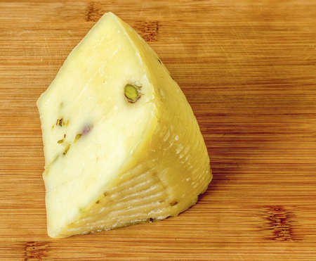Italian sheep's milk cheese with pistachios on a bamboo cutting board up close