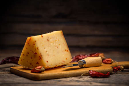 A piece of hard cheese with red pepper, spicy parmesan triangular piece on a wooden board