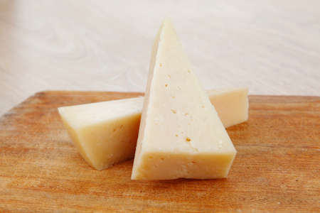 two fresh triangle french delicacy parmesan cheese pieces on wooden cut board over table