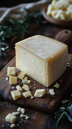 A block of artisan cheese sits on a wooden cutting board surrounded by small cheese cubes. Fresh greenery adds a rustic touch to the setting, emphasizing quality and craftsmanship.