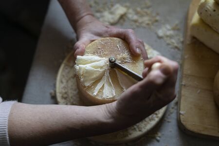 Scraping Device of Swiss Cheese Tete de moine. A man cuts cheese.