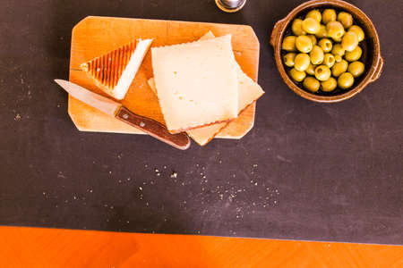 cured cheese cut with a glass of red wine, stuffed olives and extra virgin olive oil on a wooden table copy-space