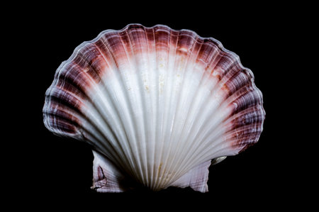 Close-up of a red and white Pecten jacobaeus scallop shell from the Pectinidae family, showcasing its ribbed texture and gradient pattern against a black background