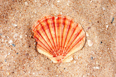 Scallop shell on sand, top view. Shallow DOF, focus on the shell.