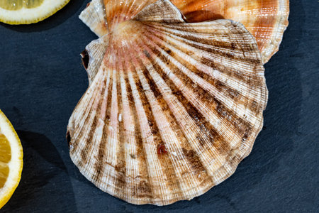 Scallop shell on a dark background close-up macro photography