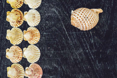 Background of shells of scallops on an old wooden background. Sea concept.