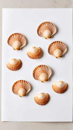 A beautiful collection of fresh scallop shells elegantly arranged on a pristine white background, showcasing vibrant colors and intricate textures ideal for culinary and nature-themed designs.