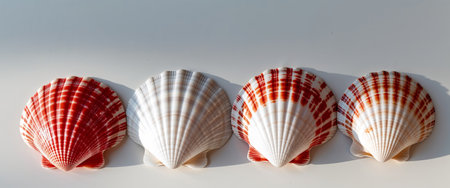 AI Generated. Three Red And White Scallop Shells Arranged In A Row