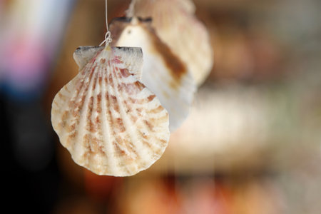 Hanging seashells on rustic wooden background; coastal decor element