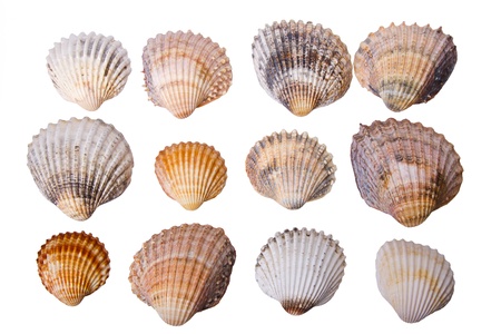 Collection of sea cockleshells on a white background