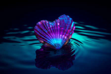 A stunning scallop shell rests on calm water, creating a beautiful reflection. This serene coastal scene captures the essence of nature