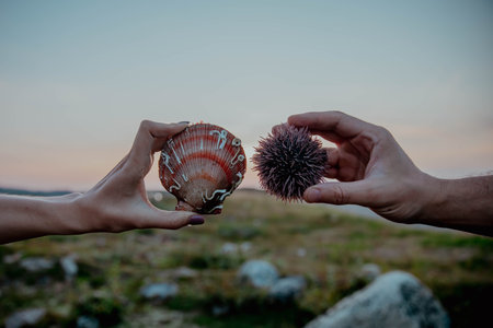 Sea urchin and shell with scallop oyster hold in hands against the backdrop of sunset