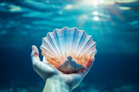 A hand delicately cradles a beautiful scallop shell, showcasing its vibrant colors against the backdrop of tranquil ocean waves, capturing the essence of summer.