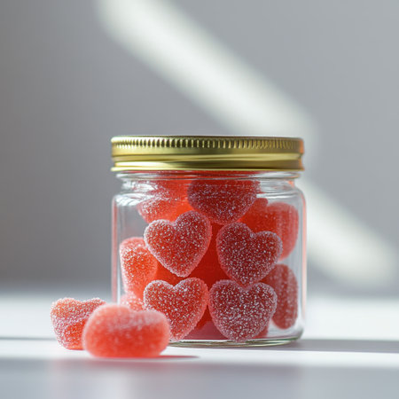 A glass jar filled with vibrant heart-shaped gummies showcases a delightful sweet treat. The soft focus background highlights the fun and colorful nature of these candies.